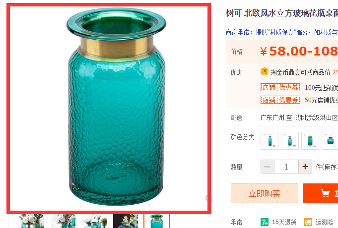 看到主图第三张的这类顾客他基本上是对我们的宝贝感兴趣的,那这个时候我们就要抓住他。那怎么用图片去抓住这个顾客呢?首先提炼出产品的优势或者是产品的细节卖点,在第三张图展示出来。用产品的卖点和优势抓住顾客的心。这就好比是喜欢了一件东西以后又发现了它很多的优点,这些优点就都成了加分项增加你对这个东西的喜欢和好感度。就比如下面这个产品,他的卖点就是瓶底的拼色、以及瓶口和瓶底的细节线条流畅没有瑕疵。把展品的优势提炼出来更能吸引买家。