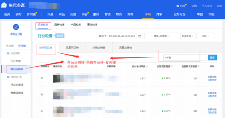 在市场行情里商品热搜榜找到一个竞争对手,看他的流量架构,找到该单品的引流词,转化词,寻找转化率高的,产值也不错的词。这个就是找词的核心!这里建议老款里面的中长尾关键词可以优先选择使用。