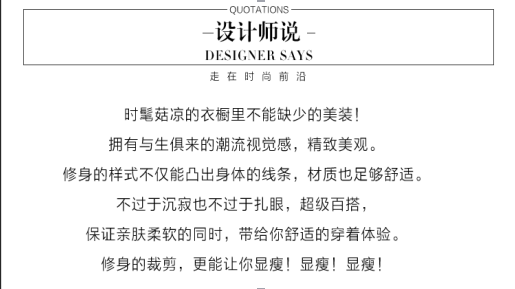 4.卖点解析,主要夸买家,每一个买家购物对自己想去购买的产品有一个美好的期望,比如一件衣服穿在自己的身上会显瘦,你的宝贝某一部分的设计能突出买家优美的线条等,这样的卖点让买家更愿意去了解你的宝贝。标品也是一样卖点解析,产品有什么优势,有什么功能等等。